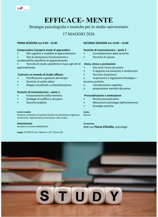 Un percorso intensivo di due mattinate rivolto a studenti universitari che desiderano migliorare il proprio metodo di studio, potenziare la memoria e affrontare in modo più efficace ansia, stress e procrastinazione.